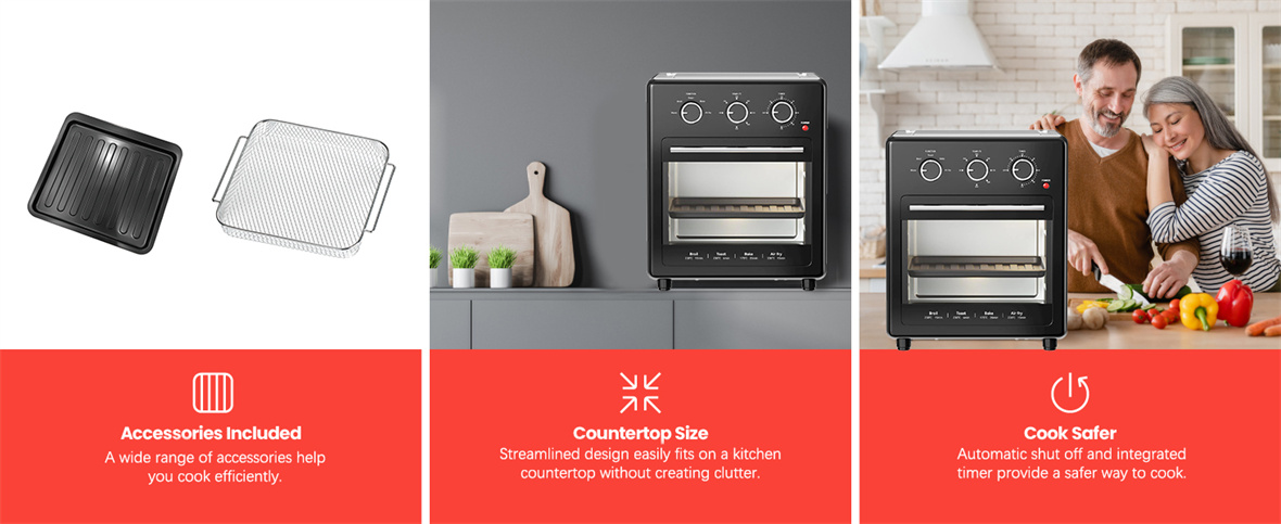 6. Удобный дизайн: Духовка-фритюрница с одинарным стеклом имеет пластиковую основу из полипропилена и декоративную панель из нержавеющей стали для дверной ручки, что повышает функциональность и эстетику и делает ее привлекательным дополнением к вашей кухне.